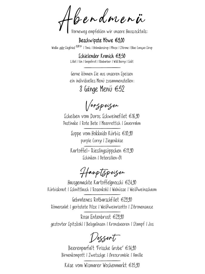 Restaurant Frische Grube | Scheuerstraße 1 | 23966 Wismar | mail@frischegrube.de | 03841 2440126